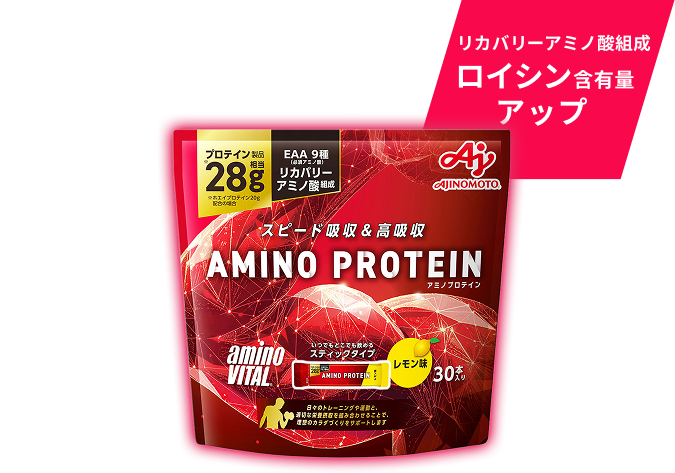 - 「アミノプロテイン」は味の素KKの世界に誇るアミノ酸配合技術により、カラダづくりに必要な栄養素を厳選、独自に配合しました。