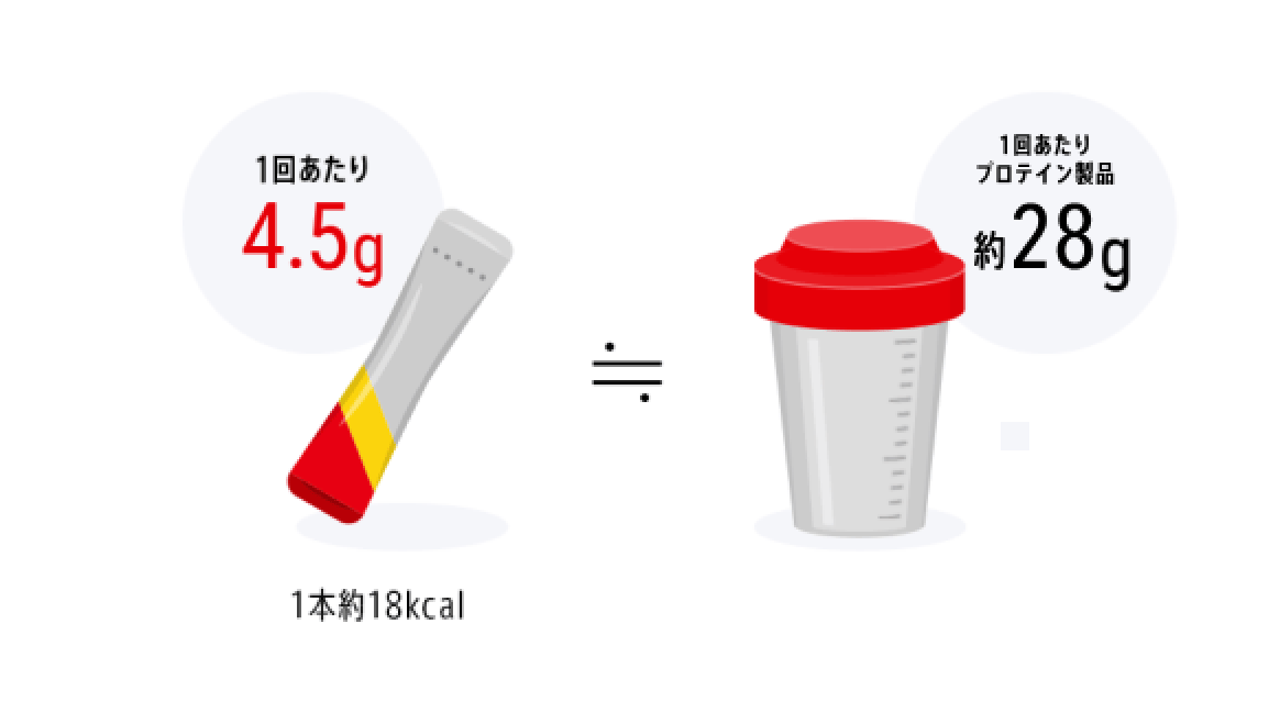 筋肉の材料を厳選することにより、1本で一般的なプロテイン約20gと同等のトレーニングによるカラダづくりが可能になります。