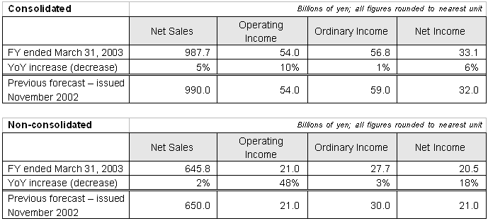 Forecasting sales to exceed one trillion yen, further record results Tokyo, May 14, 2003 – Ajinomoto Co., Inc. today announced consolidated results for the financial year ended March 31, 2003. Key consolidated and non-consolidated results are as follows. Overall results