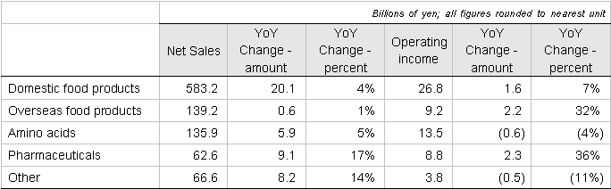 In the domestic food products business, sales of products such as Hon-Dashi and Cook Do grew steadily, and sales growth also continued in soups, Amino Vital, amino acid-based sweeteners, frozen foods, coffee, Calpis products, and dairy products. In overseas food products, sales of flavored and mixed seasonings increased, while higher unit prices of nucleotides for the food processing industry contributed to significantly higher operating income. Sales in the amino acids business increased overall, although the impact of exchange rate movements and a reduction in unit prices for bulk amino acid-based sweeteners resulted in a year on year decrease in operating income. In pharmaceuticals, Actonel, a preparation used in the treatment of osteoporosis, was adopted by an increasing number of medical institutions and sales increased, as did sales of ATELEC, an antihypertensive cardiovascular agent, and LIVACT, a branched-chain amino acid formula for the treatment of liver cirrhosis. Shimizu Pharmaceutical’s sales after Ajinomoto’s acquisition of the company are also included in this period, and net sales and operating income both increased significantly over the previous year. For the fiscal year ending March 31, 2004 Ajinomoto forecasts consolidated sales of 1,050.0 billion yen, consolidated operating income of 65.0 billion yen, consolidated ordinary income of 67.0 billion yen, and net income of 35.0 billion yen. Non-consolidated sales are forecast at 667.0 billion yen, with operating income of 21.0 billion yen, ordinary income of 25.0 billion yen and non-consolidated net income for the period of 20.5 billion yen. These forecasts are based on an assumed exchange rate of 120 yen to the U.S. dollar. *** ENDS ***