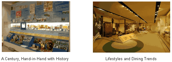 A Century, Hand-in-Hand with History Exhibits chronicle the progress of the Ajinomoto Group over the past 100 years, with examples of Ajinomoto products and advertising, and images and objects depicting their times. |