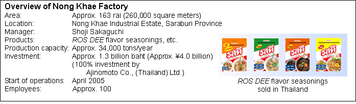 April 5, 2005 - Tokyo - Ajinomoto Co., Inc. (Ajinomoto, President & CEO: Kunio Egashira; Headquarters: Tokyo, Japan) announced today that Ajinomoto Co., (Thailand) Ltd. (President: Kanji Mimoto; Headquarters: Bangkok, Thailand), one of its subsidiaries in Thailand, has completed construction of the Nong Khae Factory, one of Ajinomoto’s largest food product factories, with the object of becoming the top food product company in Asia. Including the new factory,
