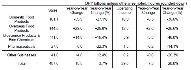 ![]() In the domestic food products business, sales of household-use products, mainly Cook Do®, were firm. However, sales decreased due to the effect of the disposal of Calpis shares. Operating income decreased due to the effect of the disposal of Calpis shares and increases in expenses including costs associated with higher purchasing prices of raw materials and other items. In the overseas food products business, sales increased due to factors including growth in sales of umami seasoning AJI-NO-MOTO®, flavor seasonings and instant noodles, in addition to the positive effect of exchange rates. Operating income increased overall, as growth in income from the consumer foods business compensated for the impact of lower selling prices for umami seasonings for the food processing industry and other factors. In the bioscience products and fine chemicals business, sales increased with the addition of sales of Ajinomoto Althea, Inc., which became a consolidated subsidiary in the first quarter, and growth in sales of amino acids for pharmaceuticals and foods and specialty chemicals. However, operating income decreased substantially with the impact of a drop in selling prices of feed-use amino acids. In the pharmaceuticals business, sales decreased substantially with the spin-off of the infusion and dialysis business units as AY PHARMACEUTICALS Co., Ltd., which became an equity-method affiliate from the second quarter. Despite the reduction of selling, general and administrative expenses and the launch of cost reduction activities, operating income decreased due to a decrease in sales of products through business tie-ups.
