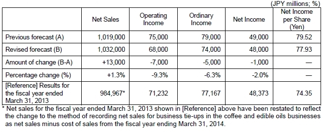 Compared with the previous forecast at the beginning of the fiscal year, which was announced on May 8, 2013, the revision of operating income is mainly due to the drop in selling prices in the feed-use amino acids business resulting from a change in market prices. Other businesses are expected to be generally steady, with consumer foods in the overseas food products business exceeding the plan, but overall operating income is projected to be JPY 7.0 billion below the previous forecast. As a result, ordinary income is expected to be JPY 5.0 billion below the previous forecast, but efforts to improve asset efficiency and other measures are expected to limit the decrease in net income from the previous forecast to JPY 1.0 billion.