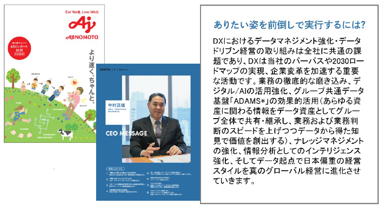 また今後あらゆる業務にAIが浸透してくる「With AI」の時代を見据え、AI・デジタルの更なる業務活用、ADAMS(Ajinomoto Data Management System)起点でデータのAI-ready化を推進し、AIとの協働体制を構築しつつ、変革を推進していきます。