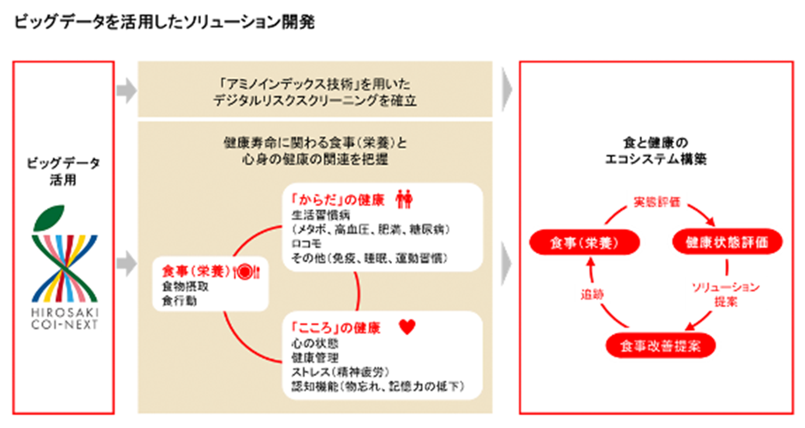アカデミアとの共同研究やスマートシティへの参画などの社会実装テストをおこない、それをもとに、食と健康の課題解決プラットフォームを社会的変革のリードレベルDX4.0まで広げようとしています。その例ですが、弘前大学COIでは、世界最大規模の食と健康に関するビッグデータが取得されています。