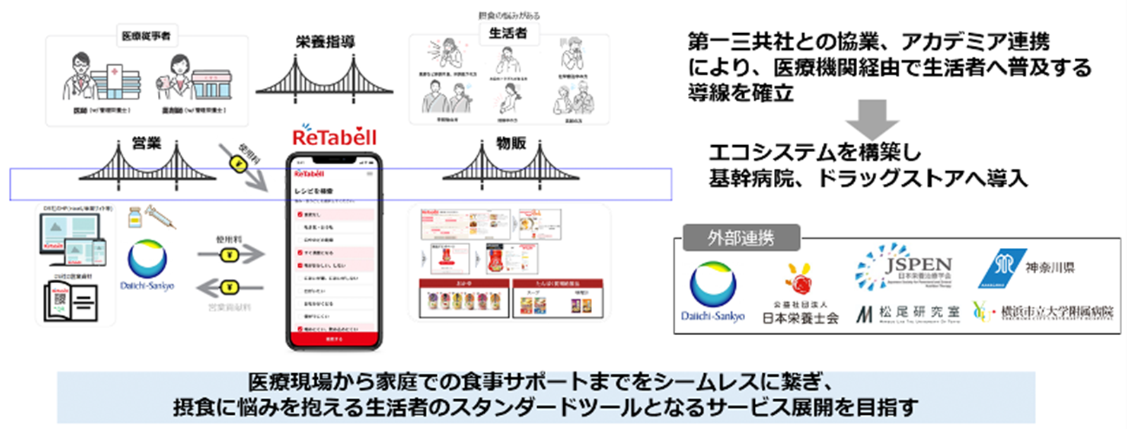 医療現場における摂食の悩みに応える、AI搭載の栄養指導・食事相談支援サービス。「食欲がない」など、摂食の悩みから利用者の「体調」と「嗜好」に合わせて栄養関連学会ガイドラインに準拠した、レシピと食事のヒントを提供。