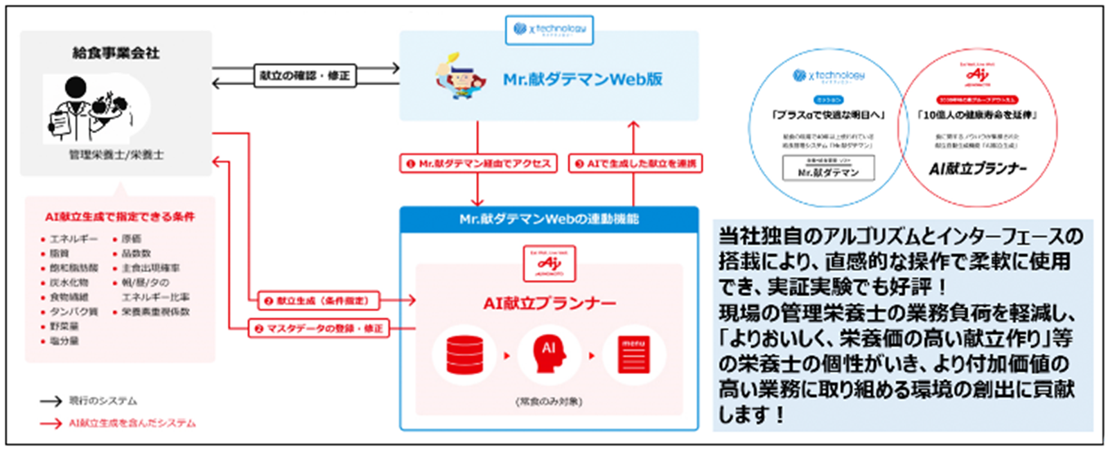 現場の献立作りでの管理栄養士の悩みごと、即ち、栄養バランス、コスト、食材重複、季節行事等の現場の様々なニーズ、複雑な条件に合致した献立作りをサポートするお助けAI献立生成サービス。