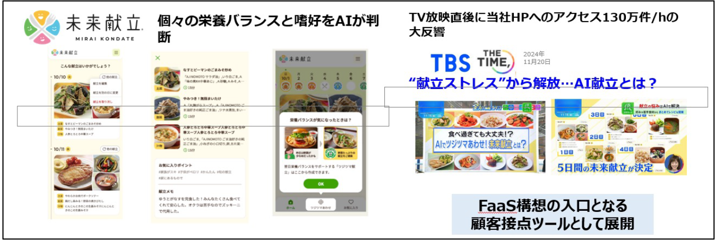 高血圧や糖尿病等、いわゆる生活習慣病の患者数は年々増加傾向にあります。今すぐに生活に支障はなくとも、進行すれば心疾患や腎不全等重篤な病気につながると言われています。生活習慣病の罹患者は40−50代が多く、予防のためには20−30代からの行動変容が必要で、食事が重要な鍵であることが各種データで明らかになっています。ところが生活習慣病患者とその予備軍はまさに仕事や子育てに忙しい年代であり、食事の栄養バランスに気を配ることが難しい世代でもあります。そこで味の素グループは「FaaS構想」を考えました。