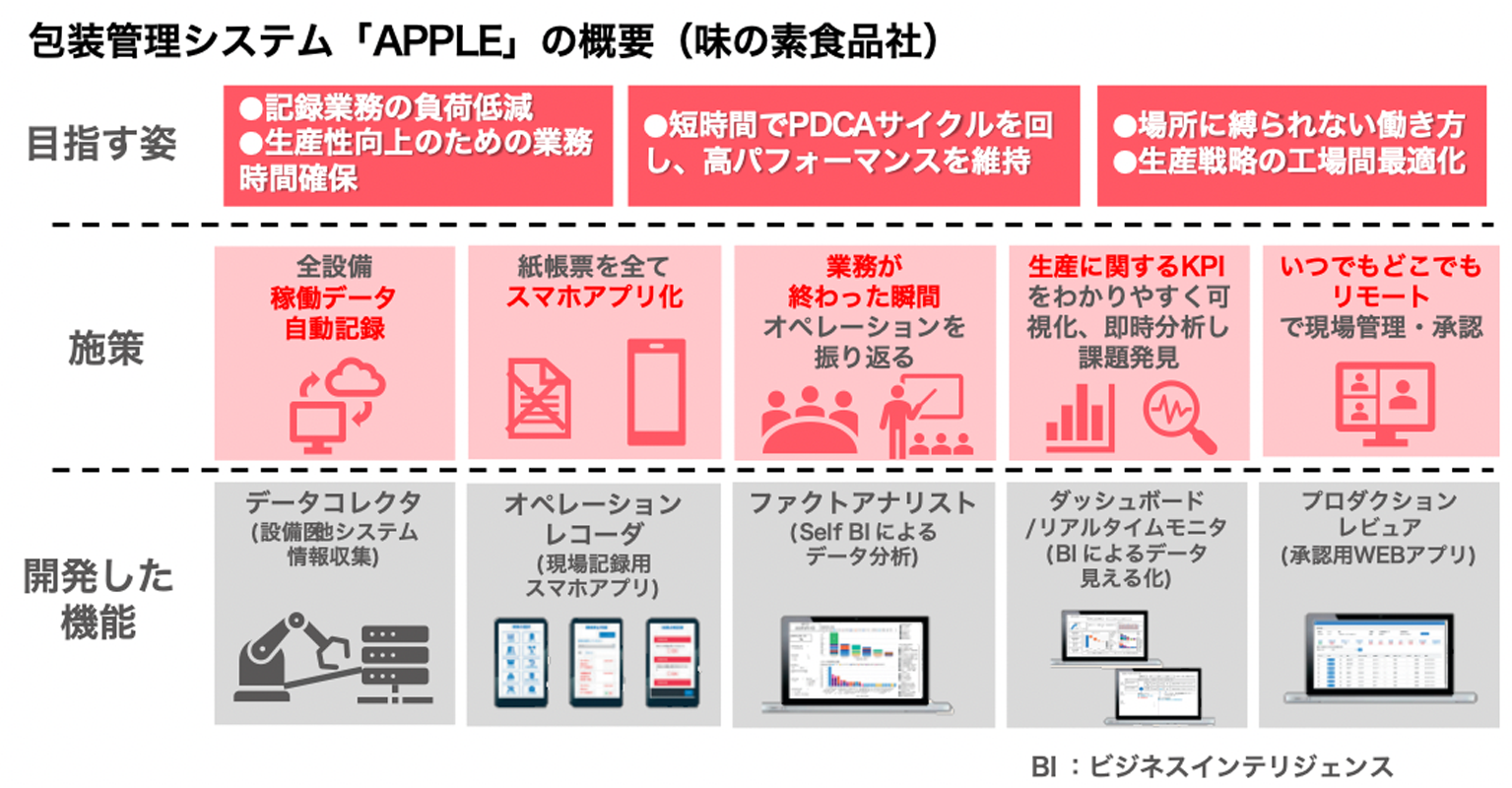 - 調味料・加工食品の生産・包装を行っている味の素食品㈱では、包装工程に様々な規格の多種多様な設備があり、毎日10-20枚の紙帳票を記録するのに多くの時間を要していました。また、データの分析にも時間がかかり、十分な改善活動ができないという課題がありました。こうした中、日本における少子高齢化に伴う生産年齢人口の減少、働き方ニーズの多様化も背景に、同社は工程管理業務を標準化した包装管理システム「APPLE」の導入に取り組みました。様々なシステムベンダーと協働し、誰でも使えるアプリを開発。記録媒体を複雑な紙帳票からアプリに切り替え、あらゆる設備のデータを自動取得し、「いつでも、どこでも」ペーパーレスでオペレーションできる仕組みを導入しました。これにより、全ての人が現場にいなくても稼働状況をチェックすることができ、速やかなデータ分析と改善を可能にしました。「APPLE」は、同社の三重工場にて検証と改善を行った後、同社の国内工場すべてに導入済みです。今後は、この先進的な包装管理システムの導入から得られる知見やノウハウを、国内外のグループ会社にも展開していきます。