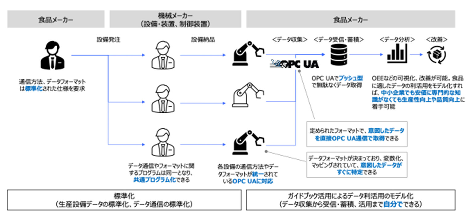 食品製造業は、他の産業と比べると労働集約型の産業であり、今後更に人材確保が困難になる中、さらなる省人化や生産性向上、品質保証の高度化といった様々な課題に直面しています。これらの課題を解決するためには、生産設備データの利活用による業務変革が不可欠です。しかし、現状では設備ごとに通信仕様やデータ形式が異なるため、データの収集・統合・分析が難しいという課題があり、生産設備データの標準化が求められています。こうした業界共通の課題を解決するため、味の素社および味の素食品社は、業界他社に協調領域での協力を呼びかけて、カルビー株式会社、サントリーホールディングス株式会社、ハウス食品株式会社、株式会社明治および食品関連機械の業界団体である一般社団法人日本包装機械工業会とともに、2025年7月に「生産設備データ標準化コンソーシアム」を設立しました。