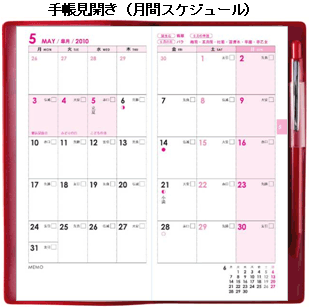 スケジュール欄は月間・週間の2段階構成。記入欄を大きく設け、書き込みやすい構成になっている。また、手帳の冒頭には一目で見やすい「年間カレンダー」を。女性の立場で考えた「私のカレンダー」も備えている。