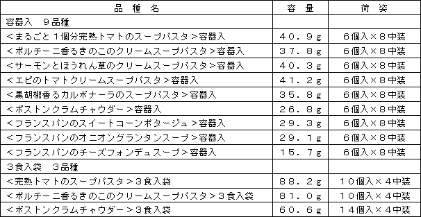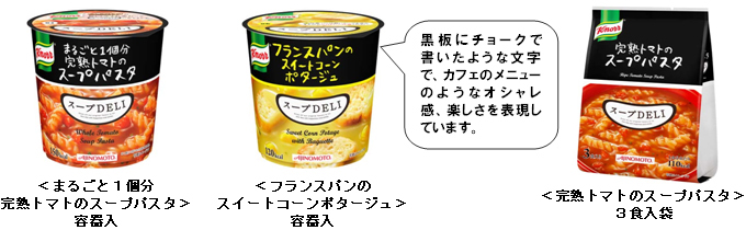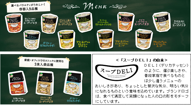 そこで今回、パスタやフランスパンなどの具材がしっかり入った“食べごたえ”がある<食べるスープ>シリーズとして「クノール スープDELI」を新発売します。パスタやフランスパンなどの具材をとろーり濃厚スープに絡めて食べるおいしさとともに、9種類の豊富なメニューラインアップを取り揃えているので、デリ(デリカテッセン)でメニューを選ぶように、その日の気分や、一緒に食べるものに合わせて、自由に選ぶ楽しさも味わえます。容器入に加え、家庭内ストックに便利な袋入品種を発売することで、オフィスや家庭など幅広くご利用いただけます。 当社は、「クノール スープDELI」ブランドを展開することにより、“昼食オケージョン”向けのスープの需要を強化し、スープ市場全体の活性化を図ります。人気俳優・向井理さんを起用したTVCMの放映を予定しており、 コミュニケーションを通じた“昼食オケージョン”訴求も積極的に行います。 2011年度の「クノール スープDELI」の売上目標は、約53億円(消費者購入ベース)です。 希望小売価格 : 設定せず お客様向けお問い合わせ先 : フリーダイヤル 0120−688181 1.製品概要: