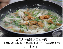 「健康・栄養セミナー」のスタートから一年が経過し、3県16市町村において合計155回のセミナーを実施、のべ約2,900名の方々に参加していただきました。 参加者や地域のパートナーの方々からは「もっといろいろな場所で、数多く実施してほしい」という感想をいただいており、この度そのご要望にお応えすべく、2012年10月より、これまでの仙台市に加え、岩手県沿岸部各地へのアクセスの観点から、岩手県遠野市に新拠点を設けます。これにより、さらに多くの地域で定期的に「健康・栄養セミナー」を行うことが可能となります。 今回の新拠点稼働により、2012年度末までに、約250回(現状+100回)の「健康・栄養セミナー」の実施を目指します。 味の素グループは、復興の足取りが確かなものになるまで、被災された方々の“心と体の健康づくり”をサポートしていきます。 【味の素グループ「健康・栄養セミナー」 概要】