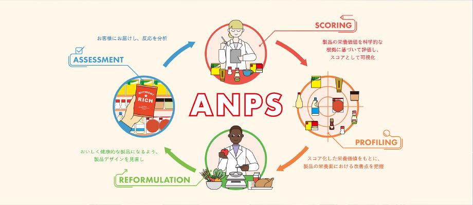 ANPS(The Ajinomoto Group Nutrient Profiling System)は味の素グループが独自に開発した栄養評価システムです。味の素グループが掲げる「妥協なき栄養(Nutrition Without Compromise)」を実現するために、おいしさはそのままに、栄養バランスの両立を評価できる仕組みとして、ANPSは科学的な検証を重ねながら設計されました。