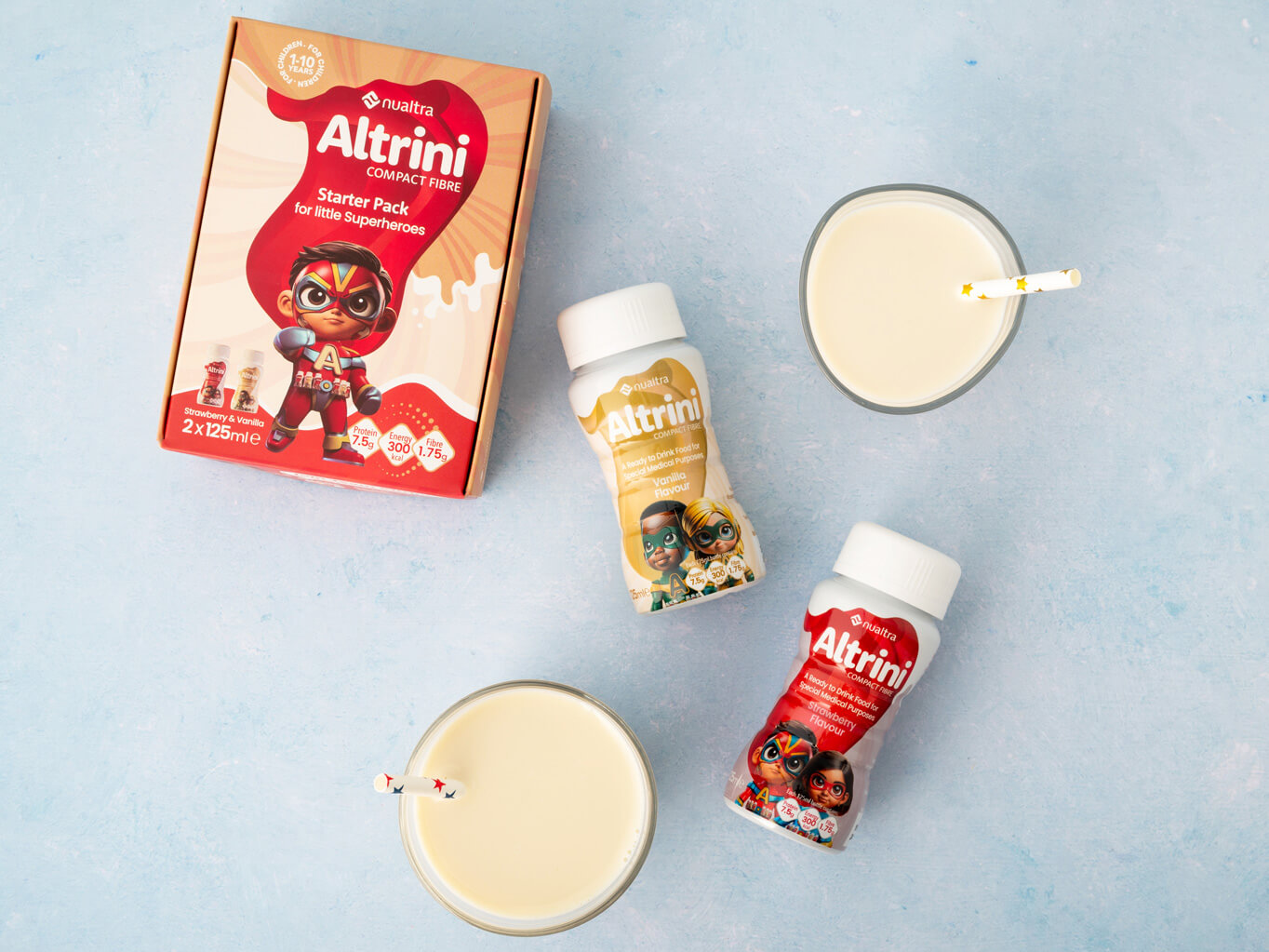 ニュアルトラ社が提供する「アルトリーニ」は、病気や治療で十分な食事が摂れず、成長に支援が必要なお子さまのために開発された栄養補助食品です。必要な栄養素をおいしく摂ってもらいたいという思いから、栄養士へのアンケートを通じてお子様が好む味や口当たり、とろみを調査し、バニラやストロベリーなど人気のあるフレーバーを採用しています。