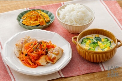 人気メニューのチキンソテーをアレンジ!ソースで野菜を一緒に食べられます。鶏むね肉は、家計にやさしいだけでなく、脂質が少なくたんぱく質は豊富な嬉しい食材。副菜にはビタミンA、C、Eを含むかぼちゃを使いました◎スープはカルシウム豊富な牛乳を入れて、運動するカラダをしっかりサポートします。