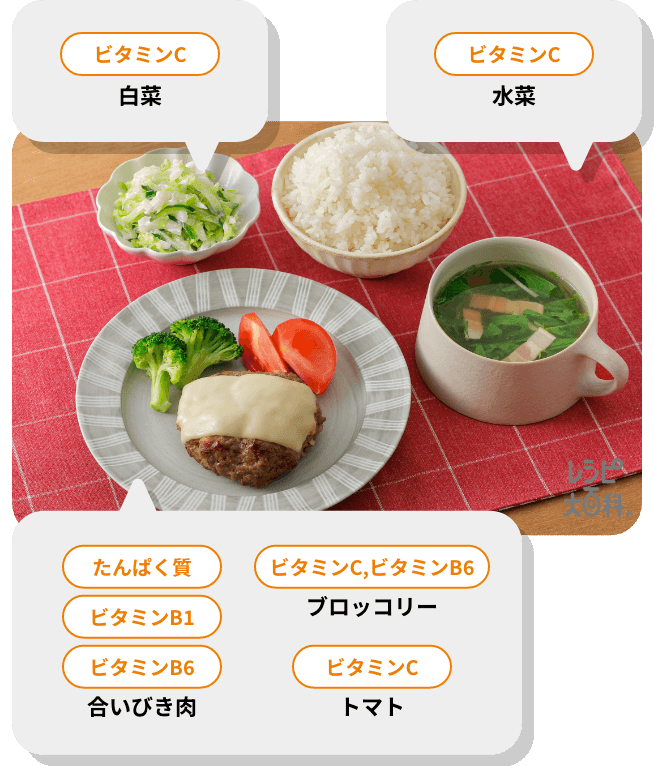 ハンバーグに使うあいびき肉は、豚肉のビタミンB1や牛肉の鉄分など、栄養の良いとこどりができるのでおススメ。タネに「クノール®カップスープ」オニオンコンソメを使うことで、味わい深くなり、ソース無しでも大満足!水菜にはビタミンCが豊富なので、スープで丸ごといただきましょう。