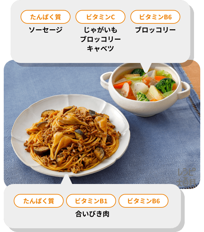 単品で済ませがちなパスタには、野菜の栄養がたくさん溶け込んだポトフを合わせて「勝ち飯」に!ポトフのじゃがいもには、熱に強いビタミンCが含まれており、カラダの疲れをとるのに役立ちます。彩りを添えるブロッコリーにはたんぱく質の代謝を促すビタミンB6が含まれます。