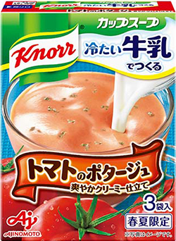 今春発売の「クノール® カップスープ 冷たい牛乳でつくるトマトのポタージュ」は、「真っ赤な完熟トマトのおいしさをモッツァレラチーズのコクが引き立てる、爽やかな味わいです。
