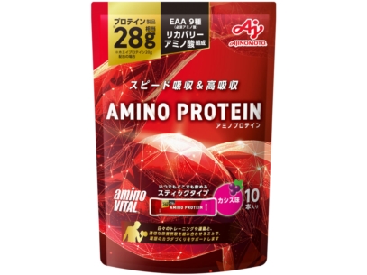「アミノバイタル アミノプロテイン」は、カラダづくりに重要な「ロイシン」を高配合した必須アミノ酸3400mgとホエイプロテインを組み合わせたプロテインです。