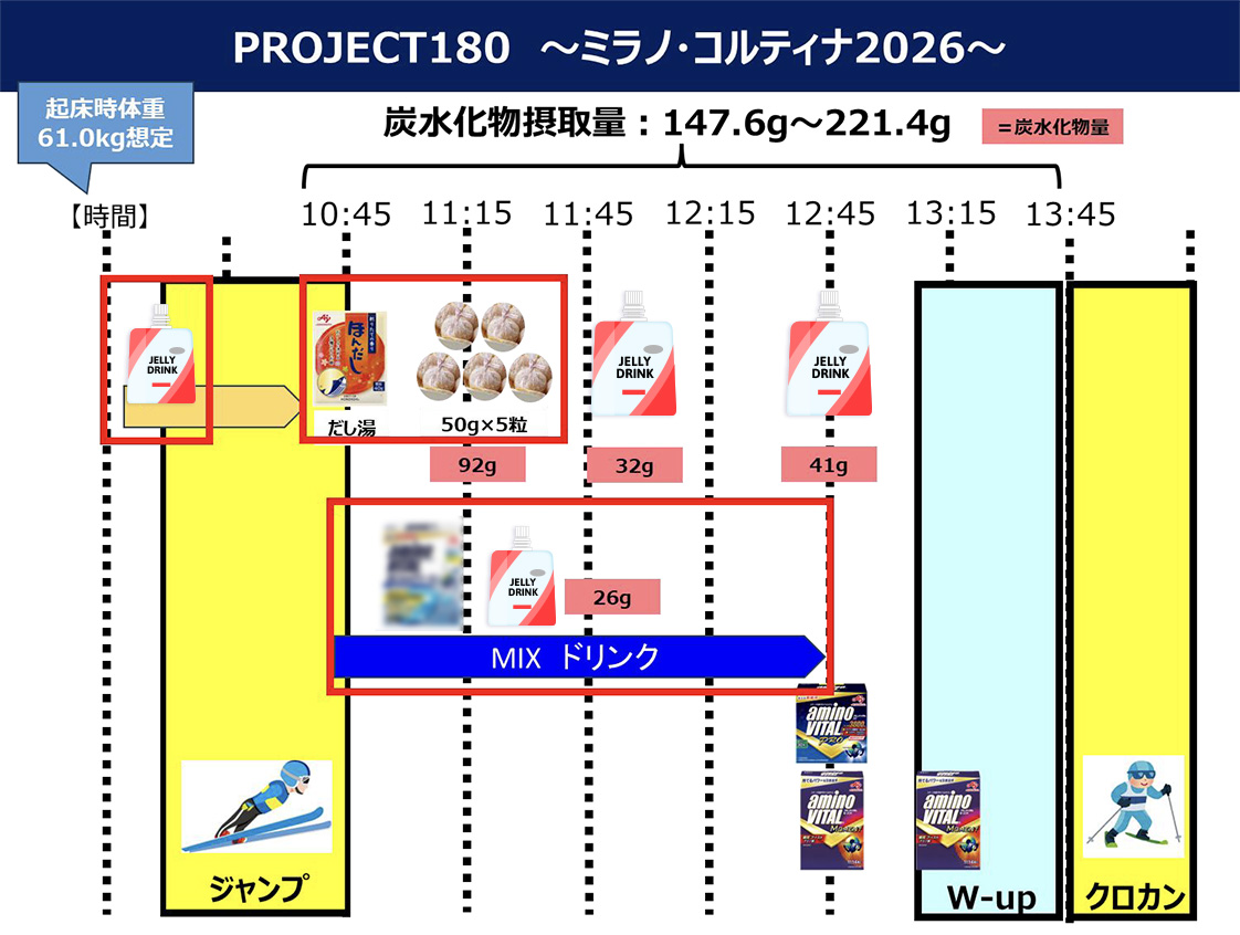 ミラノ・コルティナ2026冬季オリンピックの本番会場で行われたテストイベントにて、「PROJECT180」のトライアルを実施。試合当日の導線の中で栄養戦略を試すことで、栄養の摂取タイミングやボリュームの改善点を洗い出す。「PROJECT80」のブラッシュアップはギリギリまで続けられる。