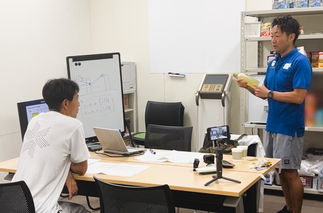 コンディショニング調査。いつ、何を、どのくらい摂ると、からだがどのように変化するのか数値化し、渡部選手の感覚と数値にズレがないかも含めて確認を行った。