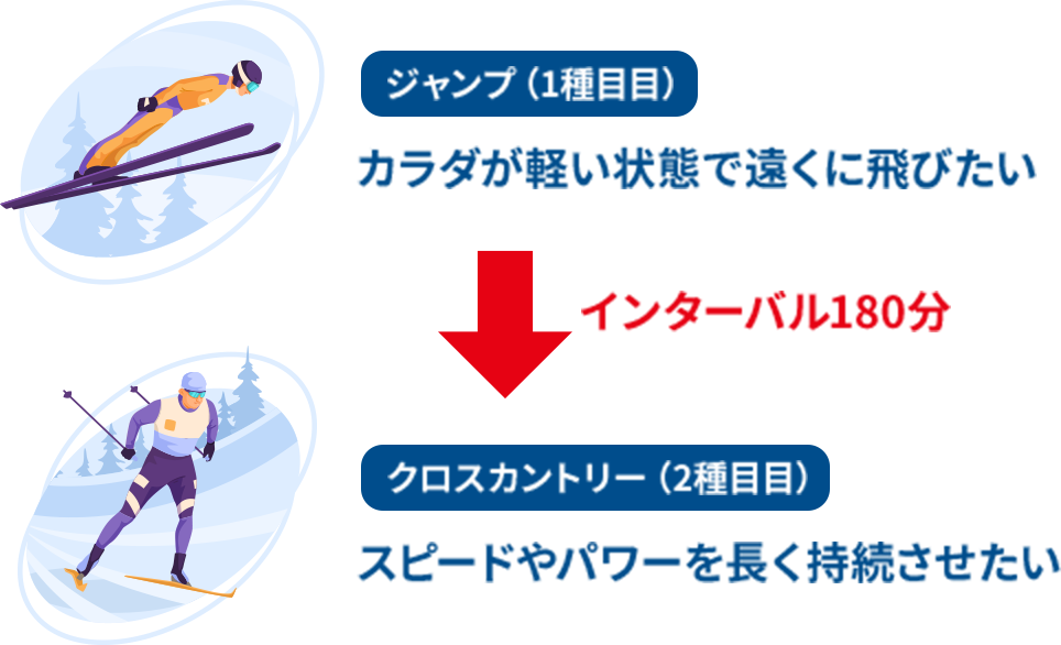 ノルディック複合はジャンプとクロスカントリーの成績で順位を競う。ジャンプの瞬発力とクロスカントリーの持久力、2つの異なる能力が求められる過酷な競技だ。ベストパフォーマンスのためには、インターバルの3時間(180分)の過ごし方が勝負の鍵を握る。